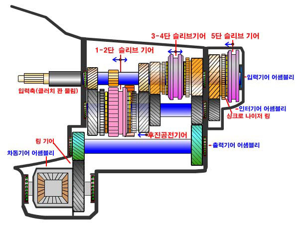 위 그림에서 1-2단, 3-4단, 5단 슬리브기어로 표시된 부분이 변속기 내부의 싱크로나이저 부분입니다.