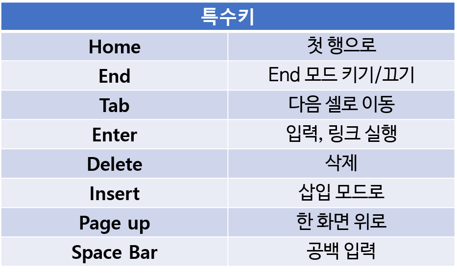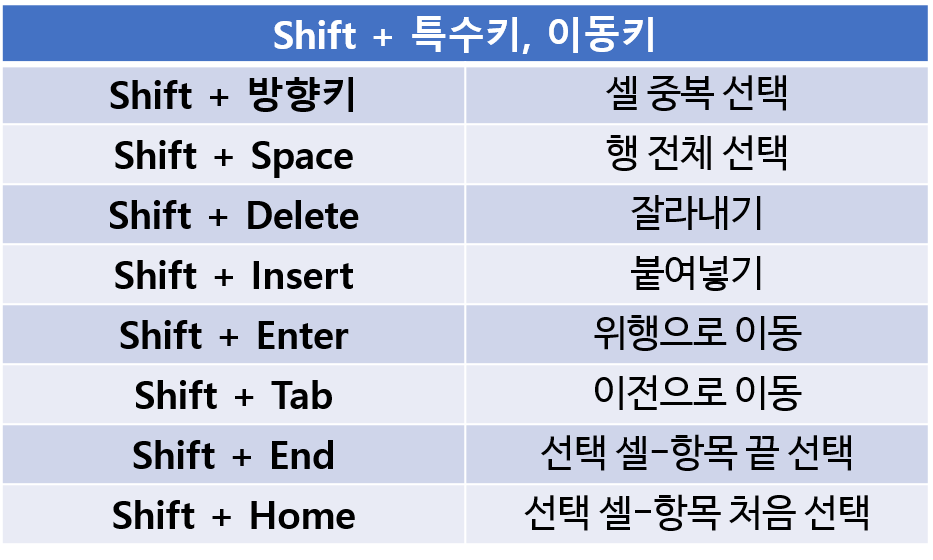 Shift + 특수키, 이동키 엑셀 단축키 모음