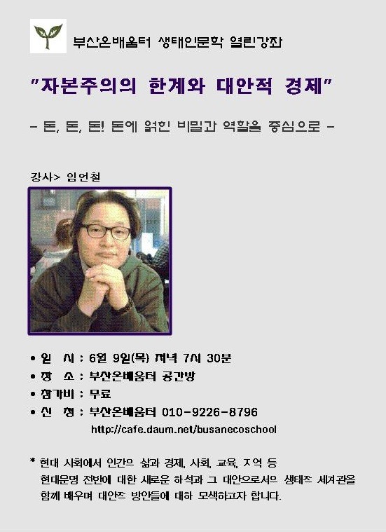 부산온배움터 열린강좌>"자본주의의 한계와 대안적 경제"(강사 임언철) 작성자뿌리(송명자)|작성시간16.05.26|조회수14 목록 댓글 0 글자크기 작게가 글자크기 크게가 다음검색 현재 게시글 추가 기능 열기 북마크 공유하기 신고 센터로 신고 댓글 댓글 0 댓글쓰기 답글쓰기 댓글 리스트