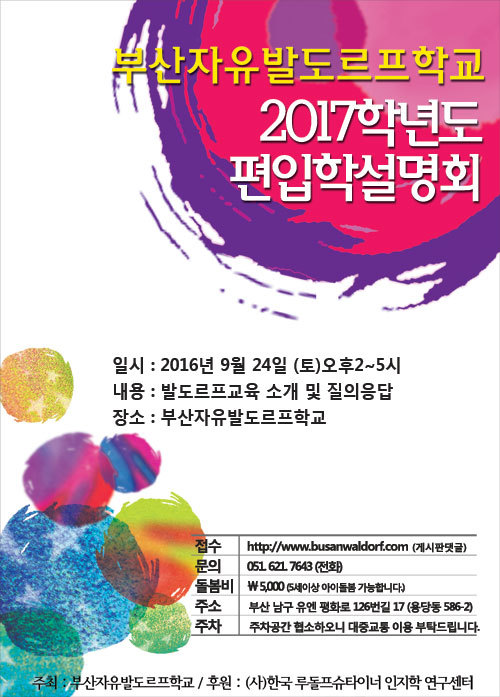 [스크랩] 2017학년도 부산자유발도르프학교 입학설명회 작성자지원엄마^^|작성시간16.09.06|조회수16 목록 댓글 0 글자크기 작게가 글자크기 크게가 참여신청은 전화 또는 카페 댓글로 신청해주세요~!! 다음검색 스크랩 원문 : 부산자유발도르프학교 현재 게시글 추가 기능 열기 북마크 공유하기 신고 센터로 신고 댓글 댓글 0 댓글쓰기 답글쓰기 댓글 리스트