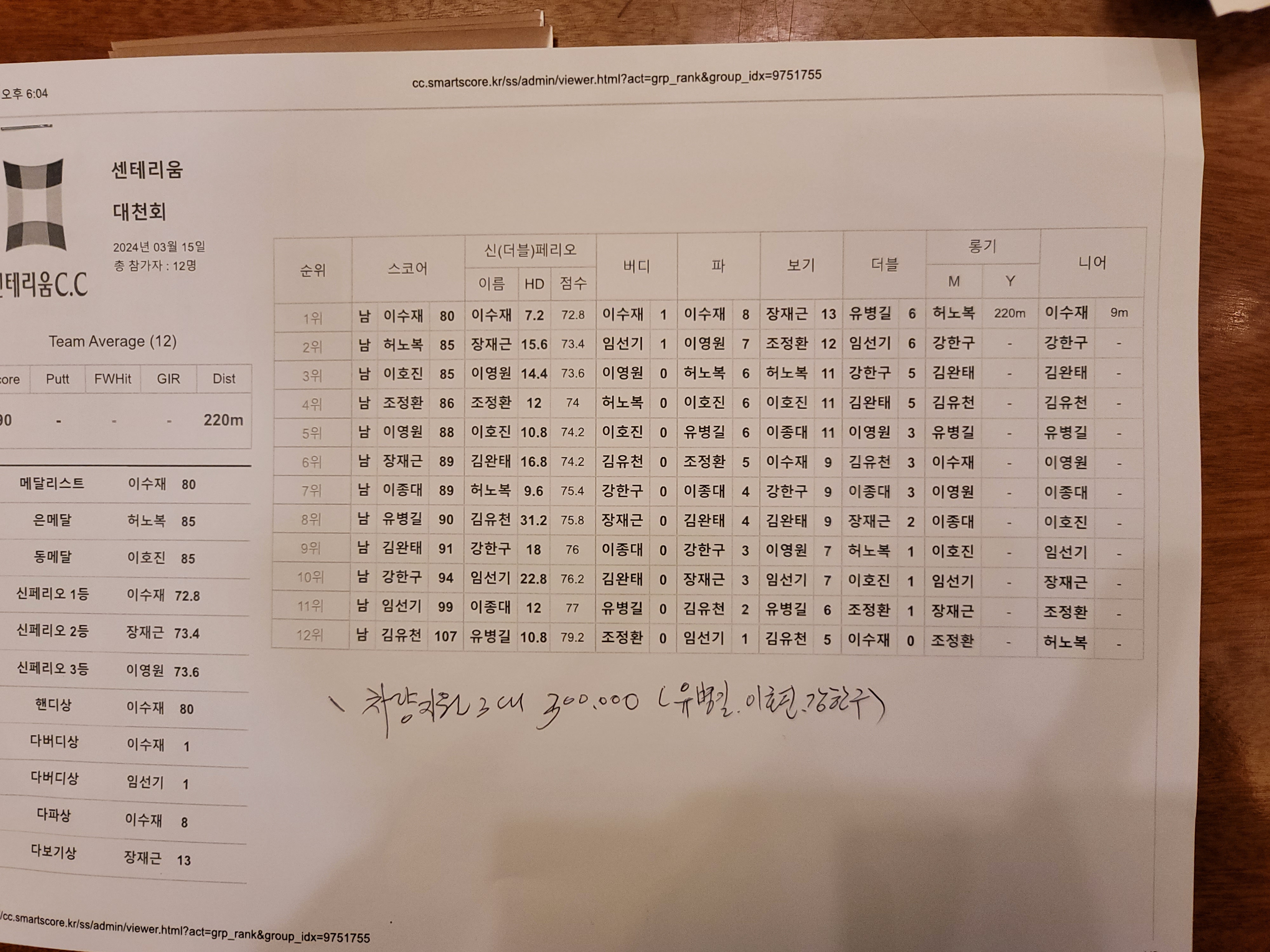 2024년 3월 월례대회 개인별 스코어(금강 센테리움) 작성자Stephen성구|작성시간24.03.16|조회수27 목록 댓글 0 글자크기 작게가 글자크기 크게가 다음검색 현재 게시글 추가 기능 열기 북마크 공유하기 신고 센터로 신고 댓글 댓글 0 댓글쓰기 답글쓰기 댓글 리스트