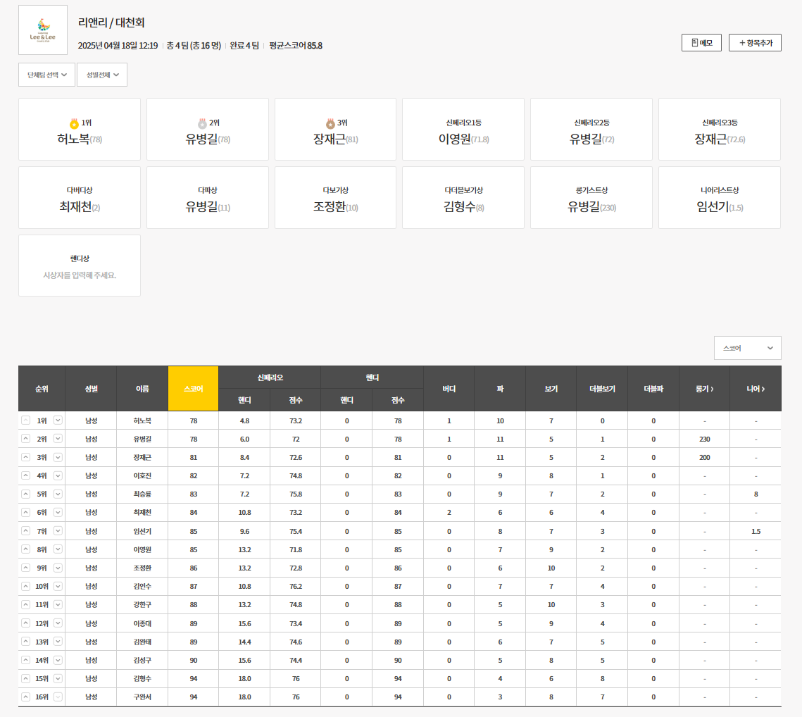 2025년 4월 월례대회 개인별 득점표(가평 리앤리) 작성자Stephen성구|작성시간25.04.19|조회수13 목록 댓글 0 글자크기 작게가 글자크기 크게가 다음검색 현재 게시글 추가 기능 열기 북마크 공유하기 신고 센터로 신고 댓글 댓글 0 댓글쓰기 답글쓰기 댓글 리스트