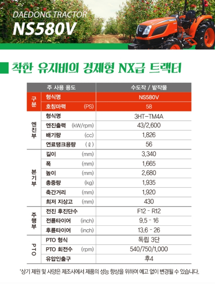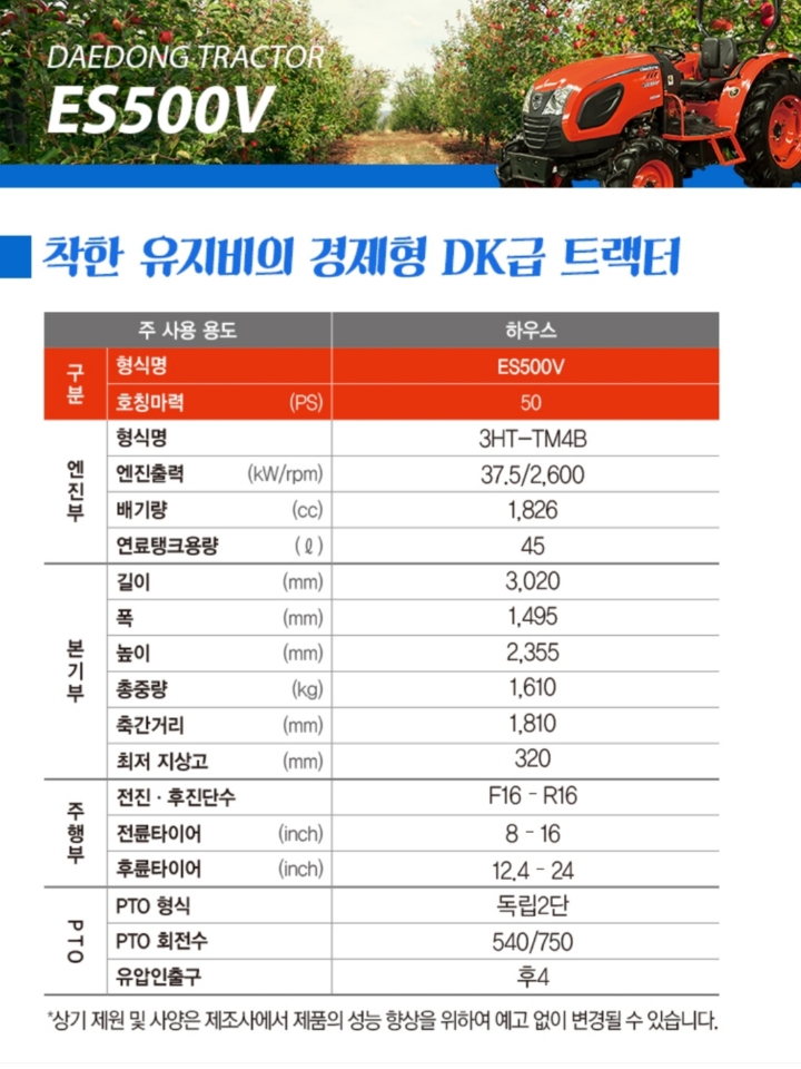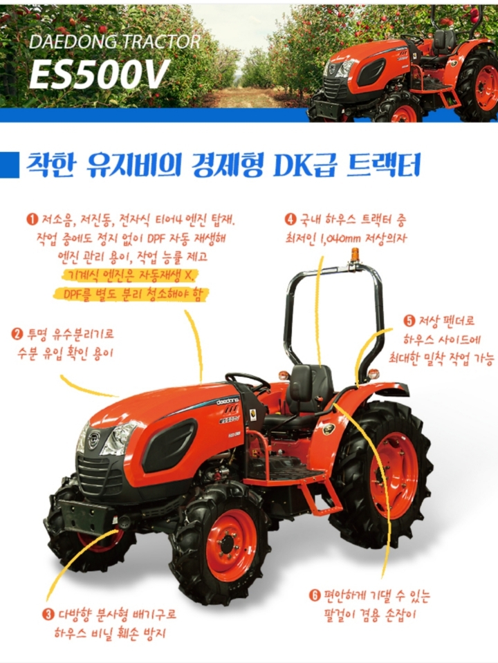 경제형 저가 트랙터 ES500V. NS580V 작성자김부장|작성시간19.11.07|조회수2,630 목록 댓글 4 글자크기 작게가 글자크기 크게가 ES500V 50마력 22,000,000NS580V 58마력 24,000,000(2019.10 기준) 다음검색 현재 게시글 추가 기능 열기 북마크 공유하기 신고 센터로 신고 댓글 댓글 4 댓글쓰기 답글쓰기 댓글 리스트 작성자마왕 | 작성시간 19.11.08 가격 저렴하네요.요즘 물가 기준으로 보자면 대단히 매력적인 가격이군요~~ 작성자독수리 | 작성시간 20.03.24 가격 착하네요 작성자김부장 작성자 본인 여부 작성자 | 작성시간 21.12.13 이미지 확대 작성자김부장 작성자 본인 여부 작성자 | 작성시간 21.12.13 이미지 확대 댓글 전체보기