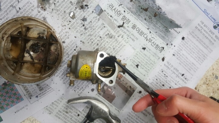 에어클리너 필터 2차 필터(스펀지)가 노후되서 조각나서 캬브레터 내부로 들어가서 연료가 원할하게 공급되지 못함!