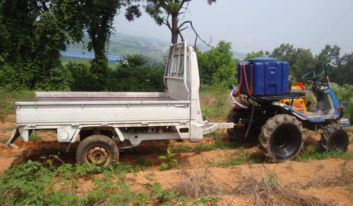 이앙기 자체 구동으로 분무기를 구동하고, 농약호스와 농약통을 이앙기에 고정하여 적재하였다가 농약이 필요할따 시동만 걸고 끌고가면 된다.