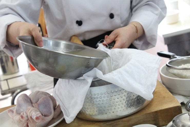 이제 육수를 면보에 걸러