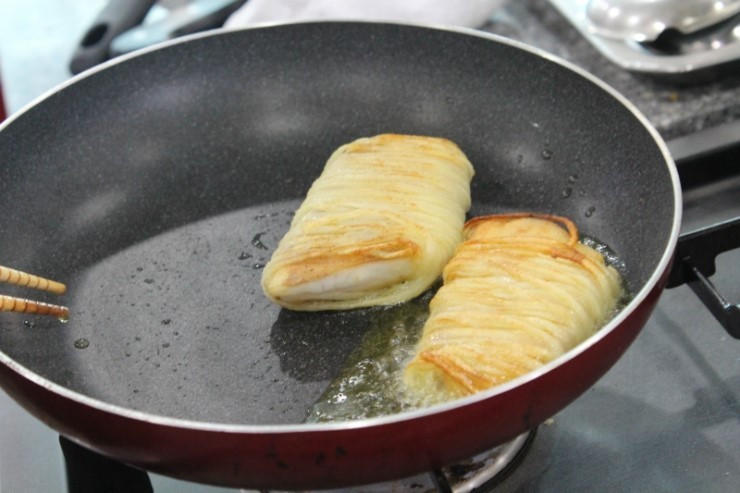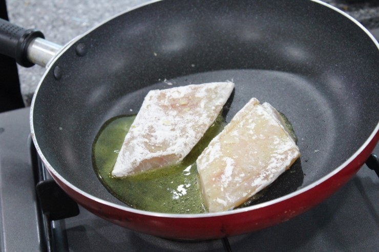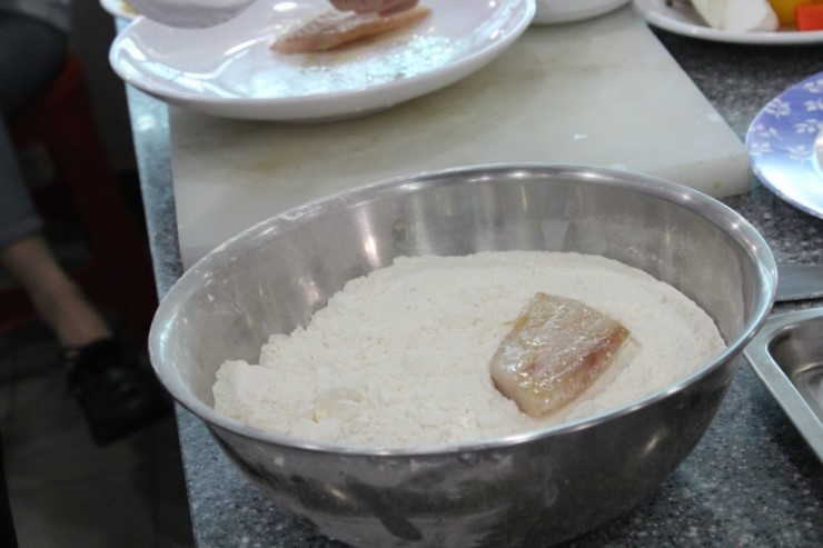 도미를 밀가루에 살짝 묻혀서 익혀줍니다.