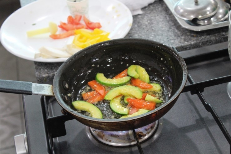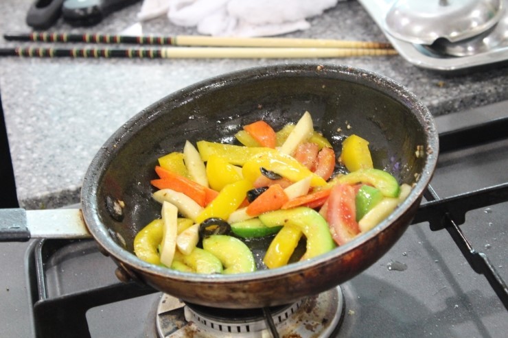 야채는 비슷한 크기로 잘라서 살짝 볶아줍니다.