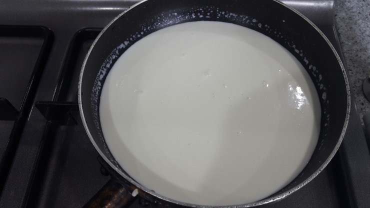 약불에 생크림과 설탕과 우유를 섞어 데워줍니다