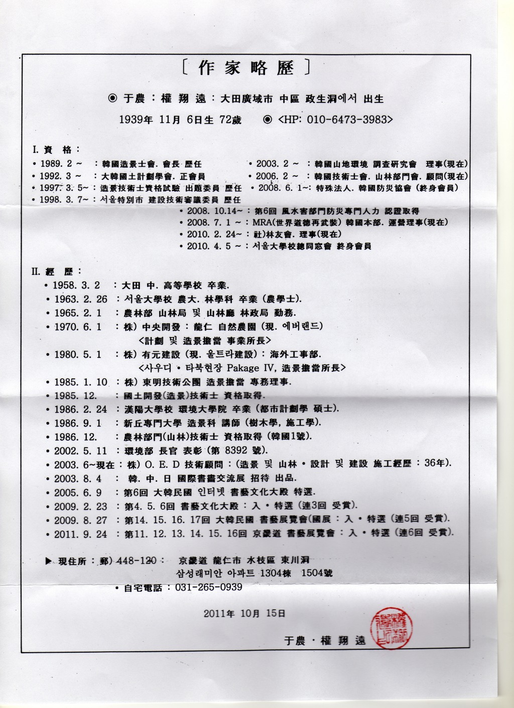 2011년도 국전에서 서예부문 특선의 영광을 찾이했다