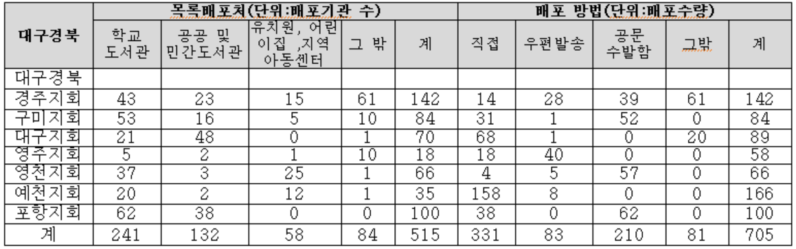 * 대구지회: 배포처 그밖 의 배포수량 20부: 달서북소리축제 부스방문객 책 배포