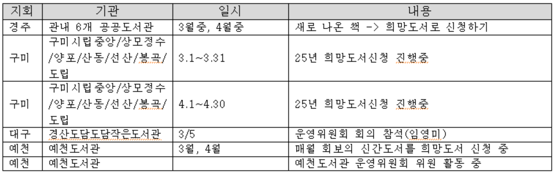 -구미, 영천, 예천, 포항, 경주, 영주 : 공공도서관에 우리 회에 대해 잘 알리고 있고 관계를 잘 맺고 있다.
