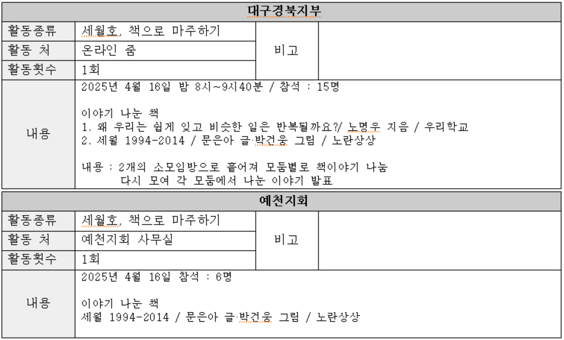 | 지회 | 구분 | 횔동내용 |