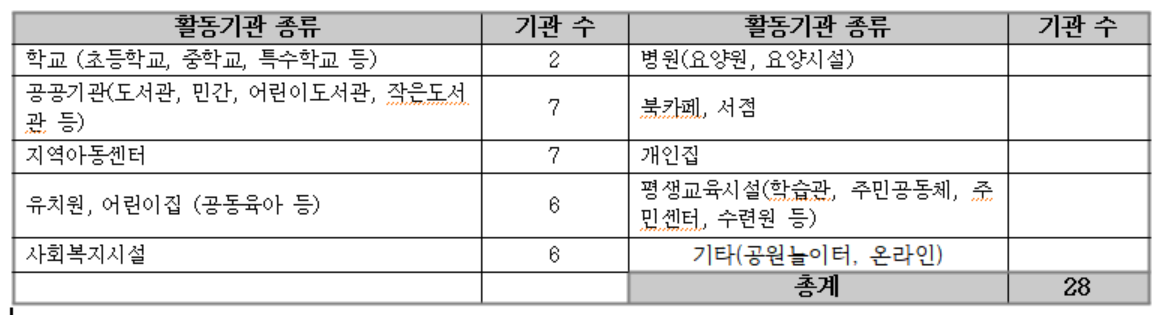 | 사회복지시설 | 장애인복지관 | 유아, 초등 | 1 | 1/2명 | 그림책 | |