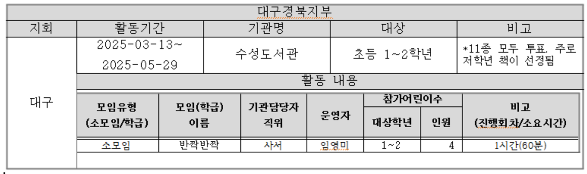 | 대구 | 학교(초등학교) | 대구 월서초 | 6학년, 2학년 | 1 | 1명 | 그림책, 동화책 |