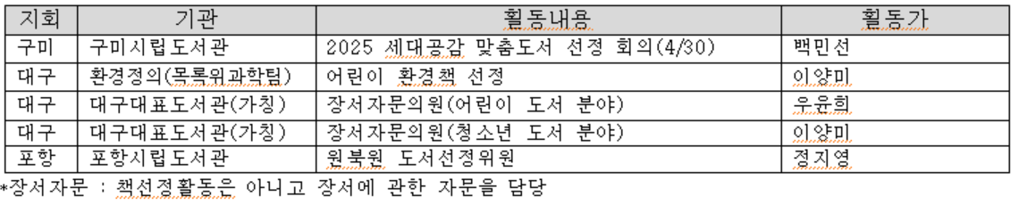 | 지회 | 기관종류 | 기관명 | 대상연령 | 횟수 | 총 활동 인원※ | 책 종류 |