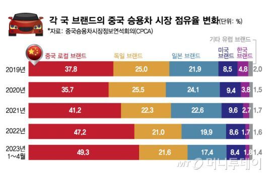 그런데 현대차의 판매량 급감에도 판매량을 유지하던 일본 브랜드의 판매가 최근 줄어드는 모습이 역력하다. 중국 승용차시장정보연석회(CPCA)에 따르면 중국 로컬 브랜드의 중국 승용차 시장 점유율은 2020년 35.7%에서 올해 1~4월 49.3%로 불과 2년여 만에 13.6%포인트 상승했다.