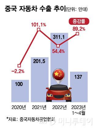 올들어 4월까지 중국 자동차 수출대수도 작년 동기 대비 89.2% 급증한 137만대에 달한다.
