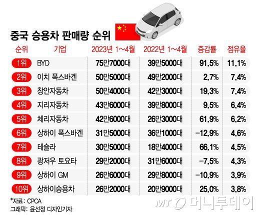 BYD는 지난해 186만대를 팔아치우며 중국 승용차 판매 1위를 차지한 데 이어 올해 1~4월에도 75만7000대를 판매하며 2위 이치 폭스바겐(50만5000대)를 멀찌감치 따돌리며 1위 자리를 지켰다. 3~5위도 각각 창안자동차(50만4000대), 지리자동차(43만6000대) 및 체리자동차(42만6000대)가 차지하는 등 로컬 브랜드가 상위권을 휩쓸었다.