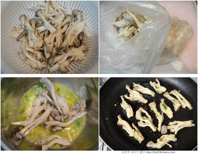 재료: 참타리버섯 1팩. 부침가루6T정도. 소금1/3T. 달걀2~3개정도. 다진파2T. 식용유