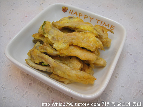 찬물에 한번 씻은후 소쿠리에 받쳐 물기가 약간 묻은채로 일회용봉투에 넣고 부침가루6T를 같이 넣어
