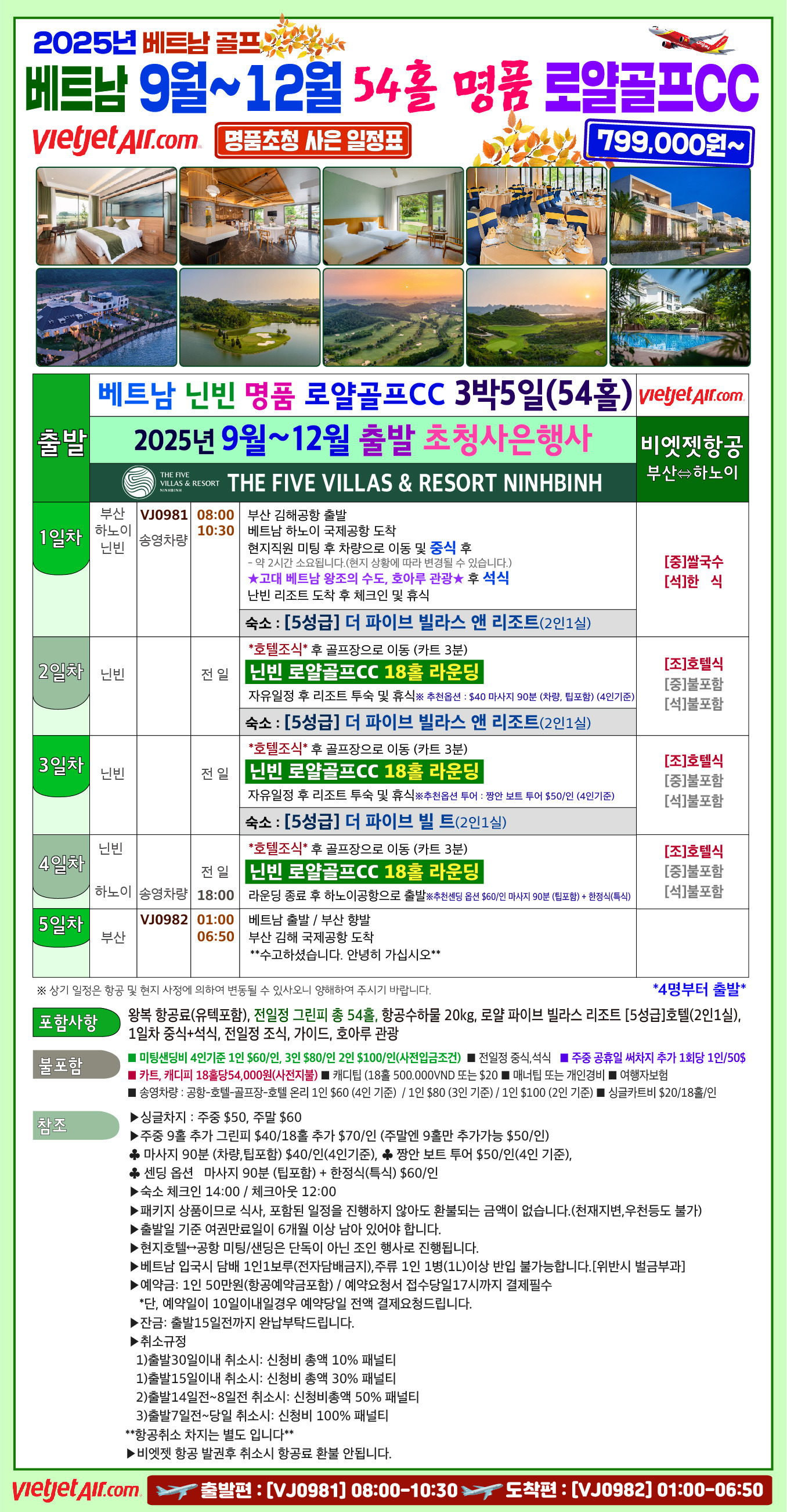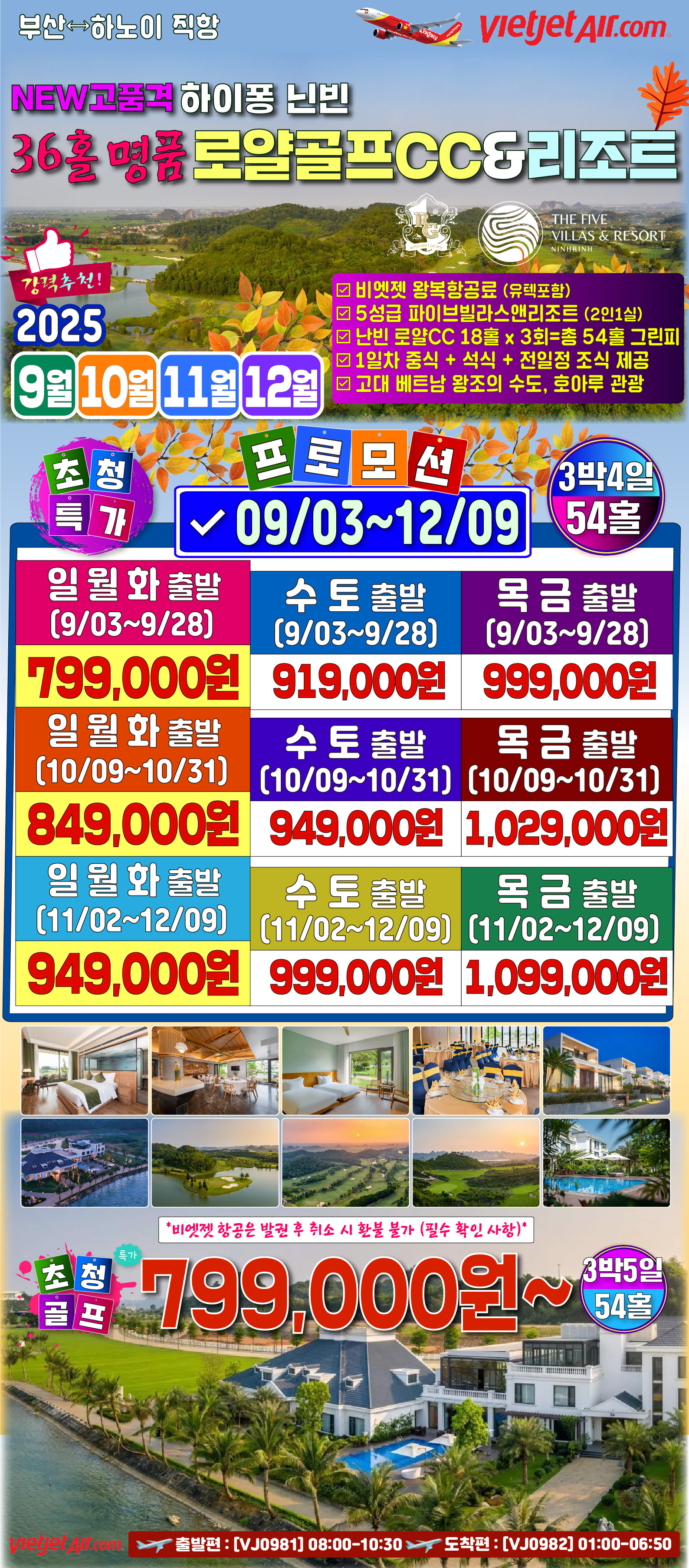 [하이퐁 닌빈 골프] 부산출발 9~12월 36홀명품 로얄골프CC 리조트 프로모션 3박5일 799000~ 비엣젯항공