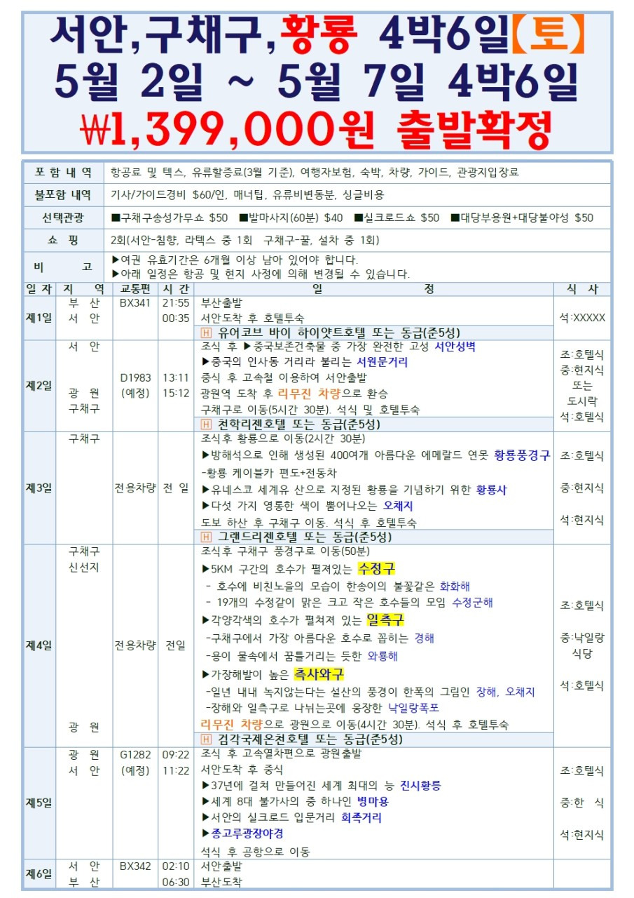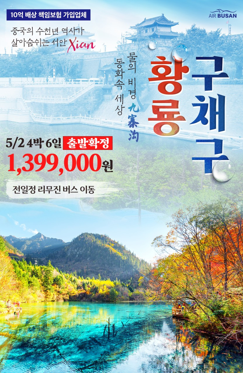 [서안 구채구 황룡] 부산출발 5월2일 출발확정 물의비경 동화속세상 시안 병마용 진시황릉 4박6일 1399000원 에어부산