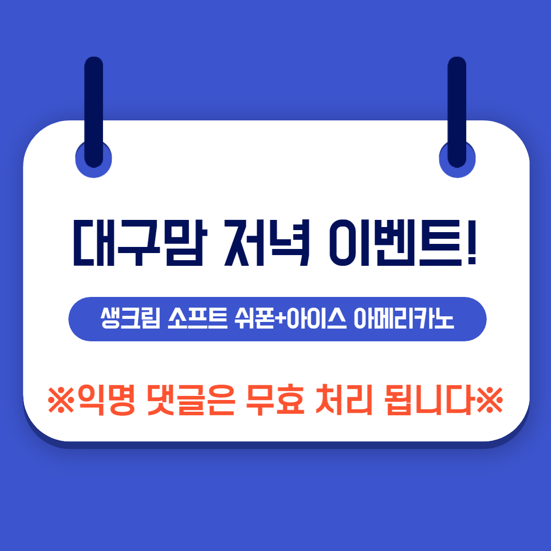 대구맘 회원분들께 신나는 이벤트 진행하겠습니다 저녁 드시고나서 커피한잔 하시라고 투썸플레이스 "찐 부드러운 세트" 증정!! ※ 이벤트 시간 ※ 15:55분 ~ 16:10분 두글자 이상으로 댓글 도배해주셔도 됩니다 단, 정회원등급 회원님은 이벤트 참여불가 ★꼬리잡기 이벤트입니다★ |