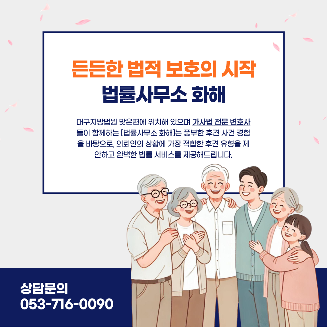 대구지방법원 맞은편에 위치해 있으며 가사법 전문 변호사들이 함께하는 [법률사무소 화해]는 풍부한 후견 사건 경험을 바탕으로, 의뢰인의 상황에 가장 적합한 후견 유형을 제안하고 완벽한 법률 서비스를 제공해드립니다. 가족을 위한 든든한 법적 보호가 필요하시다면, 저희 '화해'와 함께 시작하시기 바랍니다. 여러분과 소중한 가족의 권리를, 저희가 진심을 다해 지켜드리겠습니다.