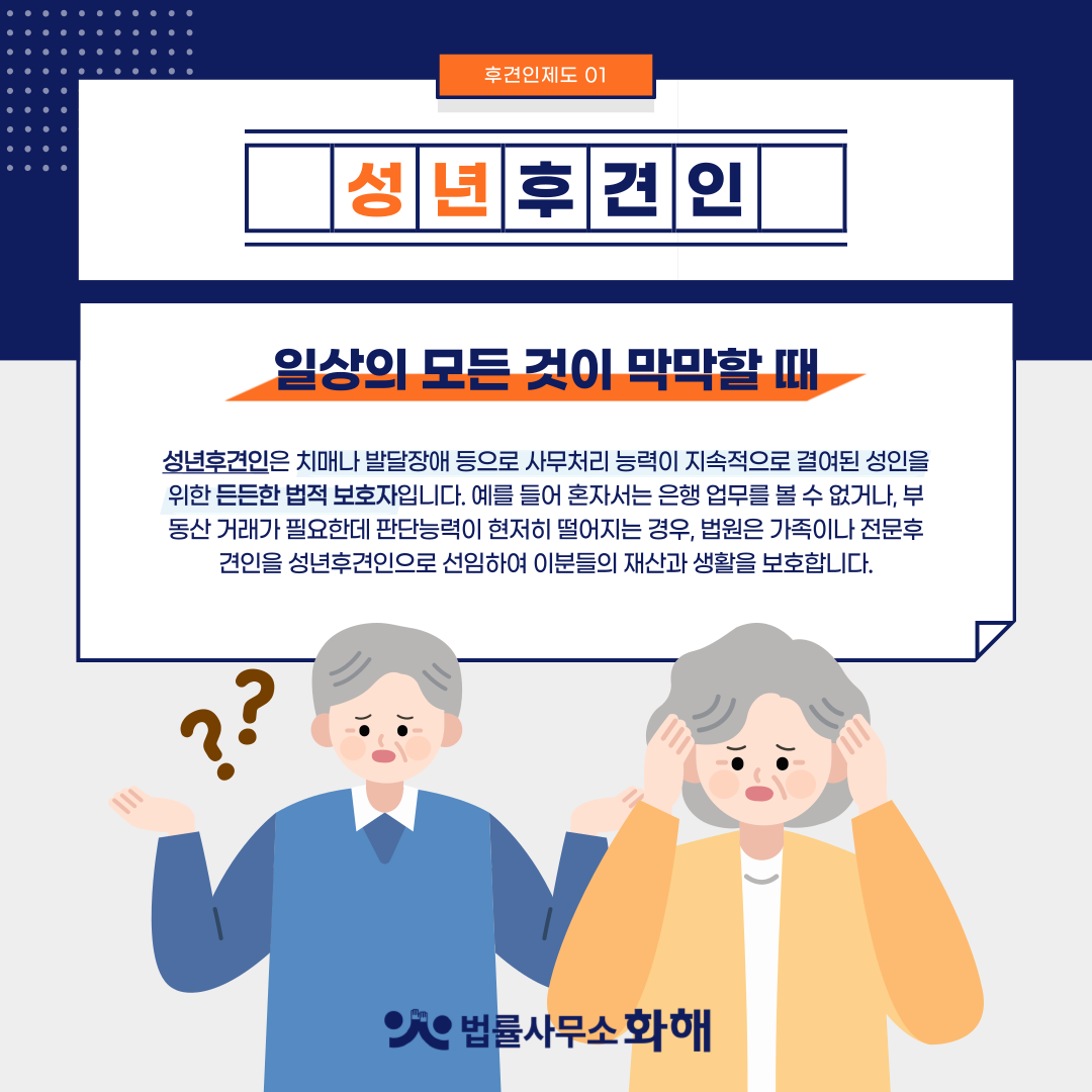 그렇다면 과연 이런 분들은 필요시 어떻게 계약을 하거나 금융거래 등을 할 수 있을까요? 우리나라 법원은 이런 분들을 위해 '후견인 제도'를 마련해두었습니다. 단어가 다소 생소할 수 있지만 누구에게나 필요할 상황이 생길 수 있는 후견인 제도. 오늘은 각각의 후견인 제도가 어떤 상황에서 필요하고, 어떤 역할을 하는지 가사법 전문 법률사무소 화해와 함께 자세히 알아보겠습니다.