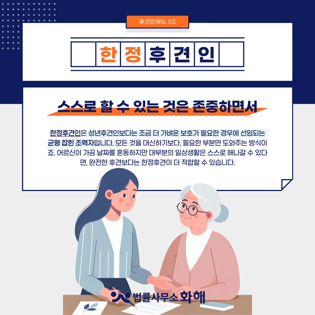 한정후견인은 성년후견인보다는 조금 더 가벼운 보호가 필요한 경우에 선임되는 '균형 잡힌 조력자'입니다. 모든 것을 대신하기보다, 필요한 부분만 도와주는 방식이죠. 어르신이 가끔 날짜를 혼동하지만 대부분의 일상생활은 스스로 해나갈 수 있다면, 완전한 후견보다는 한정후견이 더 적합할 수 있습니다.