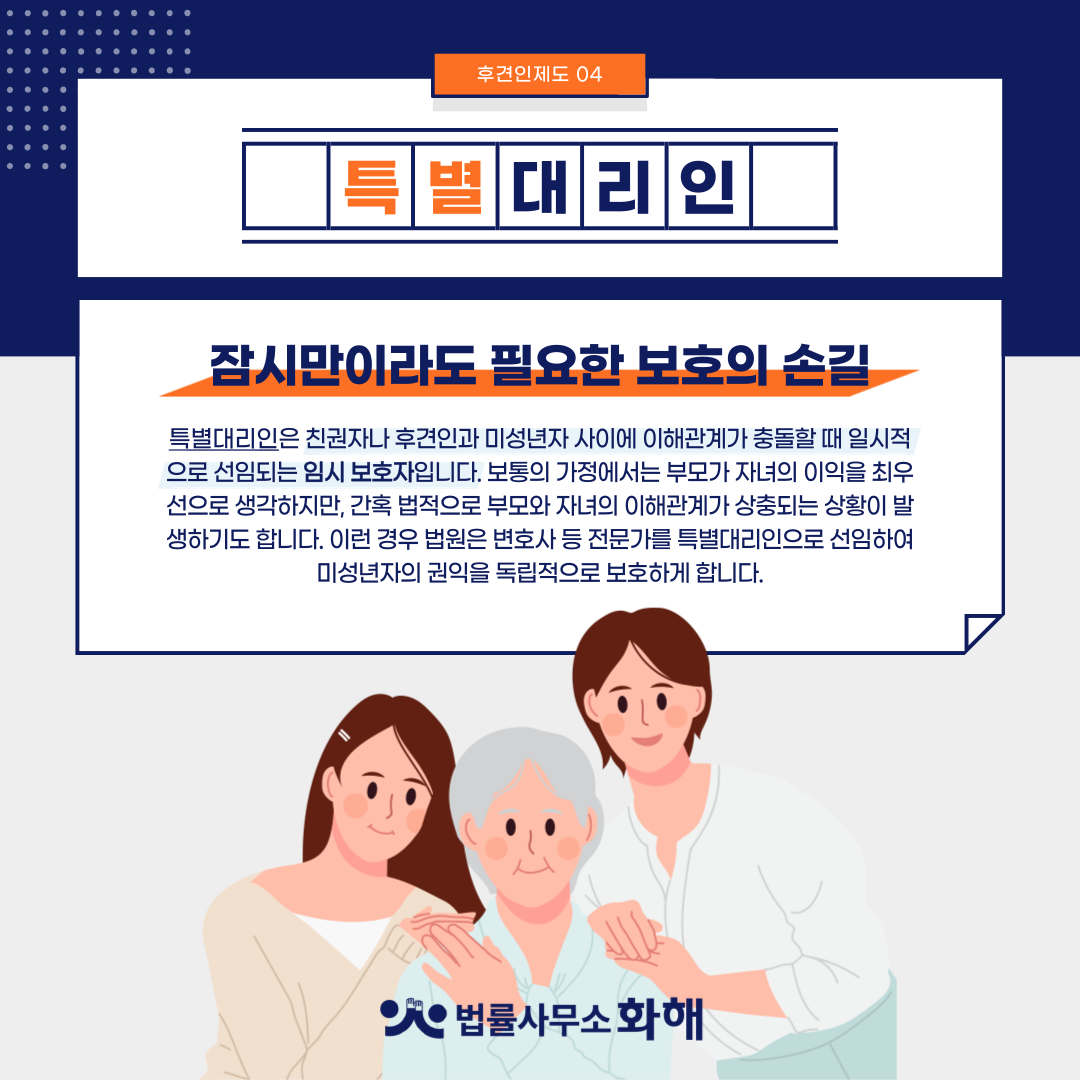 특별대리인은 친권자나 후견인과 미성년자 사이에 이해관계가 충돌할 때 일시적으로 선임되는 '임시 보호자'입니다. 보통의 가정에서는 부모가 자녀의 이익을 최우선으로 생각하지만, 간혹 법적으로 부모와 자녀의 이해관계가 상충되는 상황이 발생하기도 합니다.