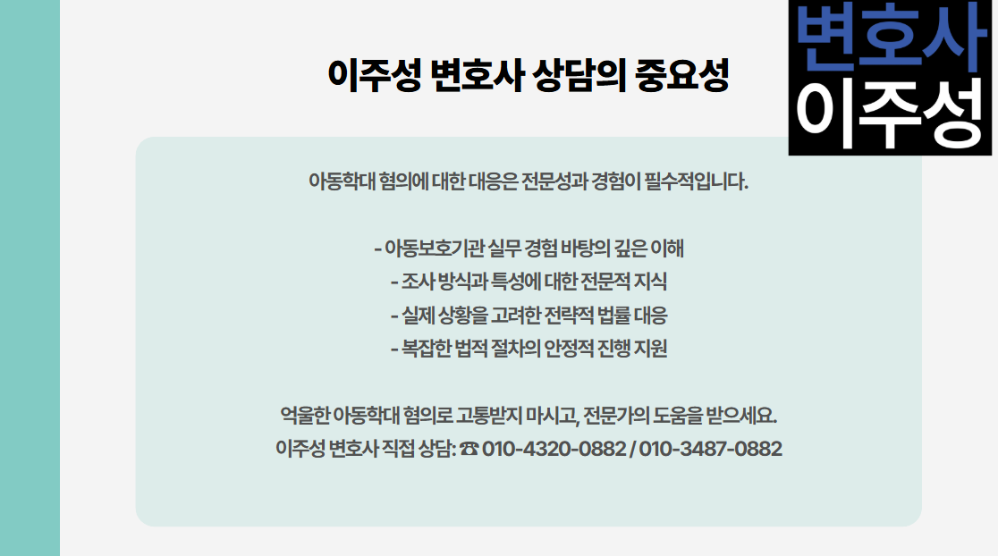 이주성 대구아동학대변호사 는 아동보호기관에서의 실무 경험을 바탕으로, 조사 방식과 특성을 누구보다 잘 이해하고 있습니다. 형식적인 법률 상담이 아닌, 실제 조사 상황을 고려한 전략적 대응이 가능하며, 복잡한 절차를 안정적으로 이끌어 줄 수 있는 대구아동학대변호사 입니다.