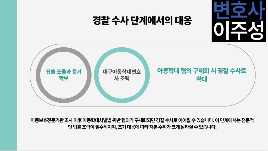 아보전 조사 이후 아동학대처벌법 위반 혐의가 구체화되면, 경찰 수사로 이어질 수 있습니다. 이때는 진술 조율, 증거 확보, 대응 전략이 철저하게 준비되어야 하며, 대구아동학대변호사 없이 혼자 감당하기엔 부담이 클 수밖에 없습니다. 초기 대응에 따라 처분 수위가 갈릴 수 있어, 대응 전략은 반드시 대구아동학대변호사 와 함께 준비해야 합니다.