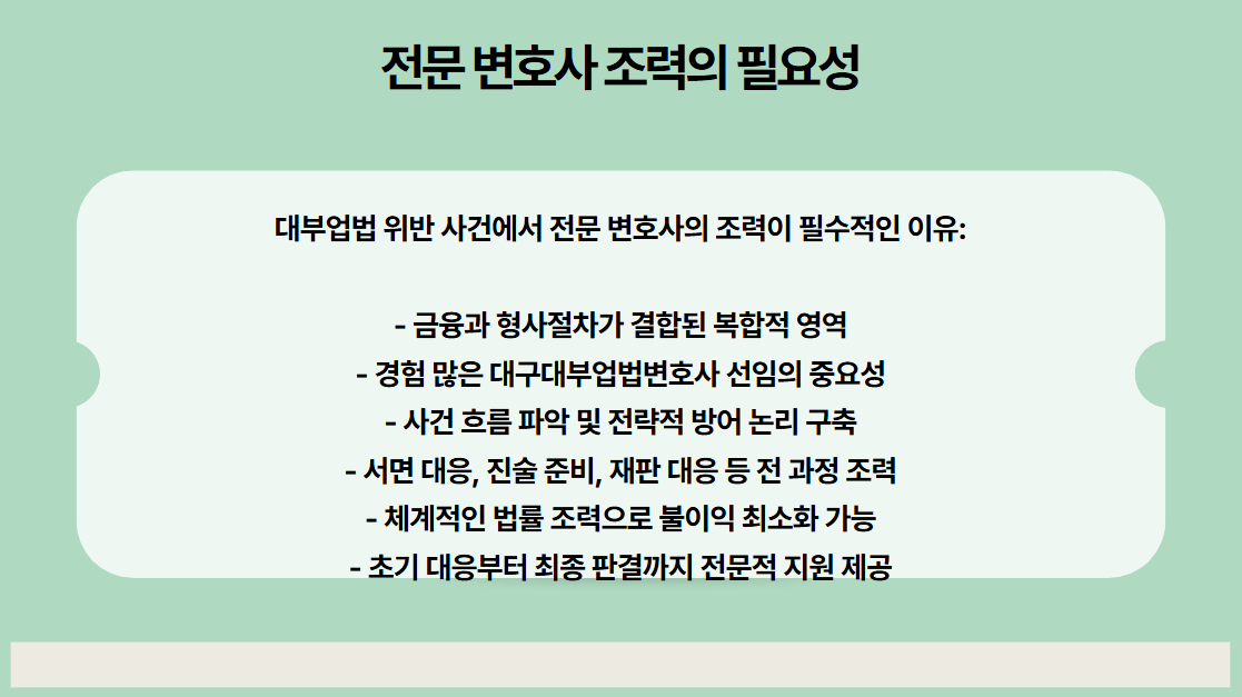 이 분야는 금융과 형사절차가 결합된 복합적인 영역입니다. 따라서 해당 분야에 경험이 많은 대구대부업법변호사 를 선임해 사건의 흐름을 정확히 파악하고, 전략적인 방어 논리를 구축해야 합니다. 서면 대응부터 진술 내용 준비, 재판 대응까지 전 과정에서 대구대부업법변호사 의 체계적인 조력이 큰 차이를 만듭니다.