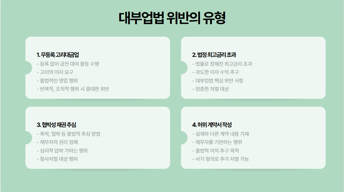 이 법률은 금전 대여와 관련된 모든 활동을 규제합니다. 대표적으로 등록 없이 고리의 이자를 요구하거나, 법정 최고금리를 초과한 수익을 챙기는 행위가 여기에 해당됩니다. 무등록 영업, 협박성 채권 추심, 허위 계약서 작성 등도 문제 소지가 큽니다. 관련 행위가 반복되거나 조직적으로 이뤄졌다면 더욱 중대한 사안으로 간주됩니다.