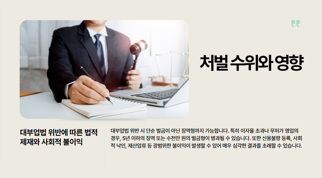 관련 법령을 어길 경우, 단순한 벌금에 그치지 않고 징역형까지 선고될 수 있습니다. 특히 이자율 초과나 무허가 영업의 경우, 5년 이하의 징역 또는 수천만 원 상당의 벌금형이 병과될 수 있습니다. 처분 결과에 따라 신용불량 등록, 사회적 낙인, 재산압류 등 광범위한 불이익이 발생할 수 있으므로 결코 가볍게 볼 문제가 아닙니다.