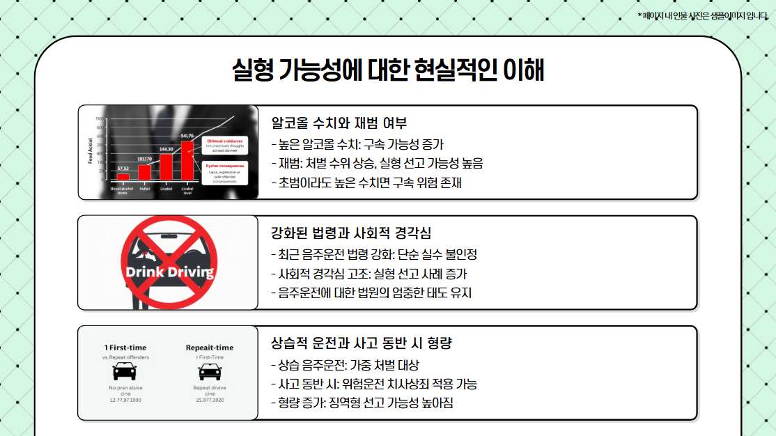 알코올 수치가 높거나 재범일 경우, 단순한 처벌을 넘어 구속 가능성도 배제할 수 없습니다. 최근 강화된 법령에 따라 음주운전은 단순 실수로 간주되지 않으며, 사회적 경각심을 높이기 위해 실형이 선고되는 사례가 늘고 있습니다. 특히 상습적인 운전 행위나 사고 동반 시 형량은 더욱 무거워질 수 있습니다.