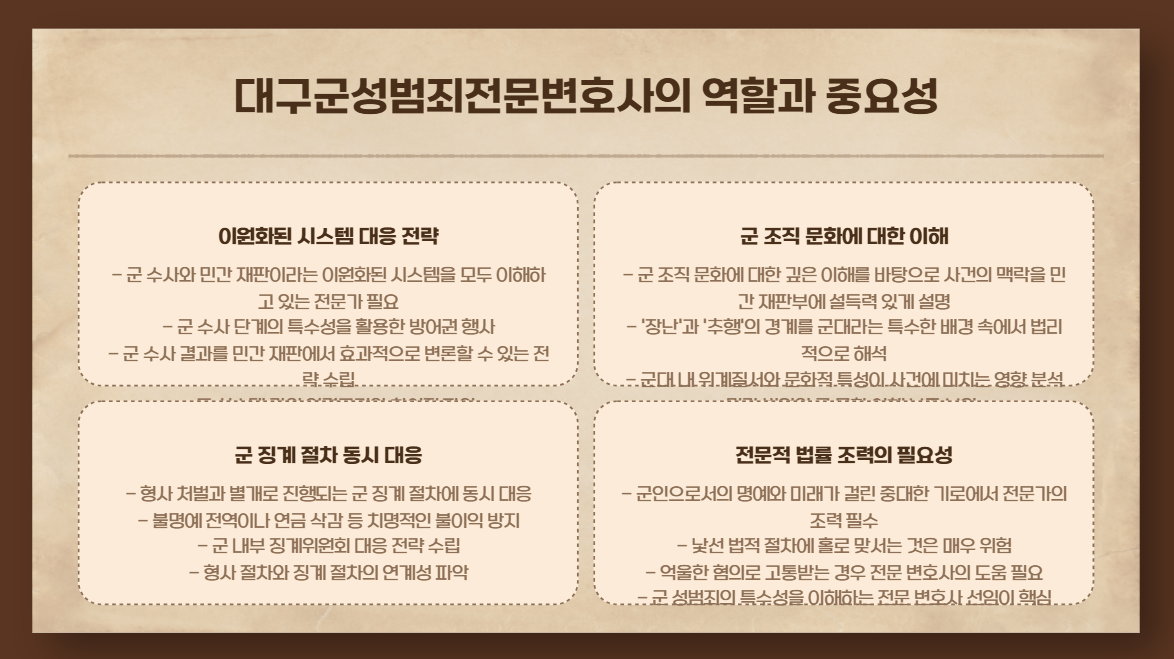 첫째, '군 수사'와 '민간 재판'이라는 이원화된 시스템을 모두 이해하고 있어야 합니다. 군 수사 단계의 특수성을 활용하여 방어권을 행사하고, 그 결과를 민간 재판에서 효과적으로 변론할 수 있는 전략이 필요합니다.