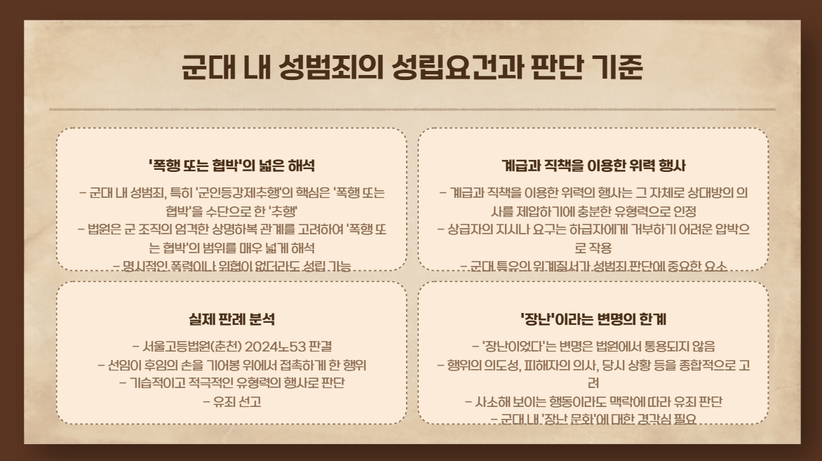군대 내 성범죄, 특히 '군인등강제추행'의 핵심은 '폭행 또는 협박'을 수단으로 '추행'을 하는 것입니다. 법원은 군 조직의 엄격한 상명하복 관계를 고려하여 '폭행 또는 협박'의 범위를 매우 넓게 해석합니다. 명시적인 폭력이나 위협이 없더라도, 계급과 직책을 이용한 위력의 행사는 그 자체로 상대방의 의사를 제압하기에 충분한 유형력의 행사로 인정될 수 있습니다.