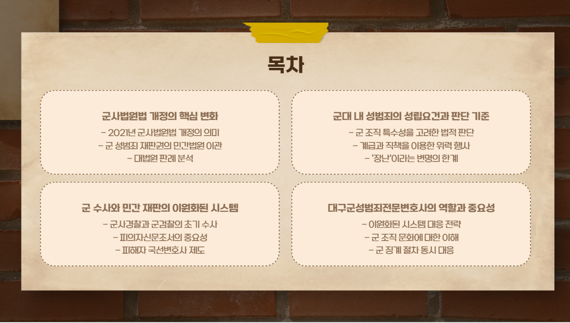 이러한 중대한 변화는 군 성범죄 혐의에 연루된 분들에게 새로운 대응 전략을 요구합니다. 오늘은 개정된 법률을 중심으로 군 성범죄의 법적 근거와 성립 요건, 그리고 왜 초기부터 대구군성범죄전문변호사의 조력이 필수적인지에 대해 상세히 짚어보겠습니다. 이러한 사건의 복잡성과 특수성은, 가정 내 미묘한 권력 관계를 다루는 대구군성범죄전문변호사의 전문성과도 유사한 깊이를 요구합니다.
