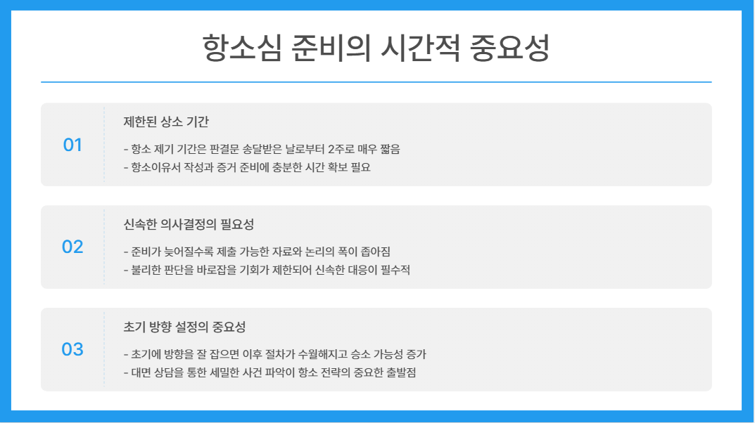 상소 기간은 매우 짧습니다. 준비가 늦어지면 제출할 수 있는 자료나 논리의 폭이 좁아지고, 불리한 판단을 바로잡을 기회도 제한됩니다. 특히 판결문 분석부터 사건 재구성까지 시간 투입이 필수적인 절차이기 때문에, 신속한 선택은 결과를 크게 바꿀 수 있습니다. 초기에 방향을 잘 잡아놓으면 이후의 절차가 수월해지고, 반대로 늦어지면 방어 전략이 크게 위축될 수 있습니다.