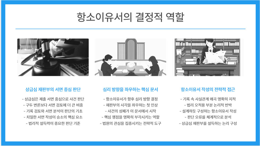 상급심 재판부는 제출 서면을 중심으로 사건을 판단하는 비중이 큽니다. 때문에 항소이유서는 향후 심리의 방향을 좌우하는 핵심 문서입니다. 기록 속 사실관계가 어떻게 왜곡되었는지, 법리가 어떤 부분에서 잘못 적용되었는지, 기존 판단이 어떤 점에서 설득력을 잃었는지 등을 설계하듯 구성해야 합니다. 작성 방식에 따라 법원의 시각이 완전히 달라질 수 있어, 사건의 성패가 이 한 장의 문서에서 시작된다고 해도 과언이 아닙니다.