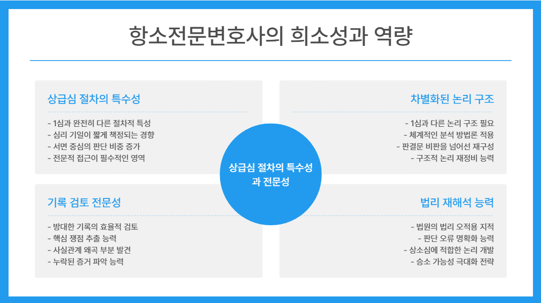 상급심 절차는 1심과 완전히 다른 논리 구조와 분석이 필요합니다. 기록 검토 방식, 법리 재해석, 판단 오류 지적 등 고도의 기술이 요구되기 때문에 항소 사건만 지속적으로 다뤄온 변호사의 가치가 더욱 높게 평가됩니다. 실무에서 경험을 쌓아온 전문가는 단순히 판결문을 비판하는 것이 아니라, 상소심에서 받아들여질 수 있는 논리를 구조적으로 재정비해 승소 가능성을 끌어올릴 수 있습니다.