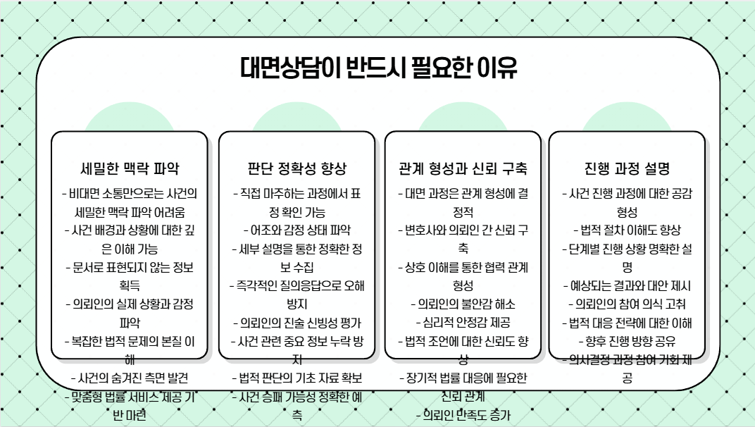 비대면 소통만으로는 사건의 세밀한 맥락을 파악하기 어렵습니다. 직접 마주하는 과정에서 표정, 어조, 세부 설명까지 확인할 수 있어 판단의 정확성이 높아집니다. 대면 과정은 관계 형성과 신뢰 구축에도 결정적이며, 진행 과정에 대한 공감과 설명이 자연스럽게 이어집니다.