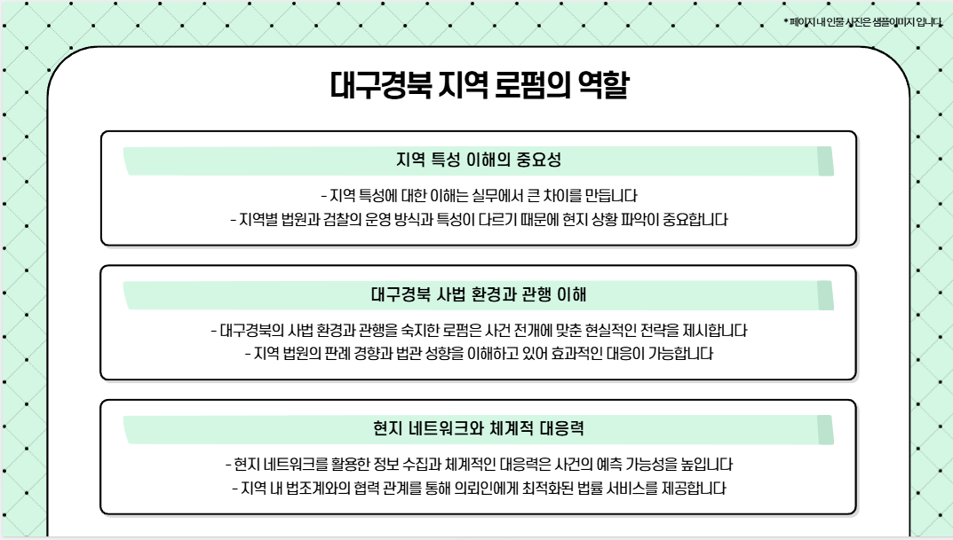 지역 특성에 대한 이해는 실무에서 큰 차이를 만듭니다. 대구경북의 사법 환경과 관행을 숙지한 로펌은 사건 전개에 맞춘 현실적인 전략을 제시합니다. 현지 네트워크와 체계적인 대응력은 예측 가능성을 높입니다.