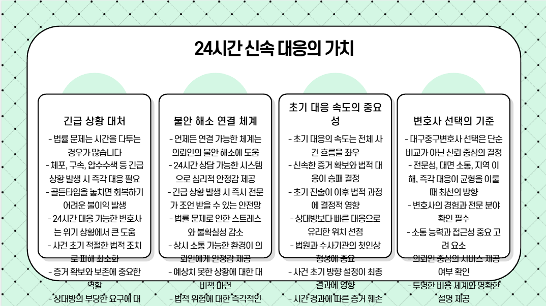 긴급 상황은 시간을 다투는 경우가 많습니다. 언제든 연결 가능한 체계는 불안 해소에 도움을 줍니다. 초기 대응의 속도는 전체 흐름을 좌우하며, 안정적인 진행을 가능하게 합니다.