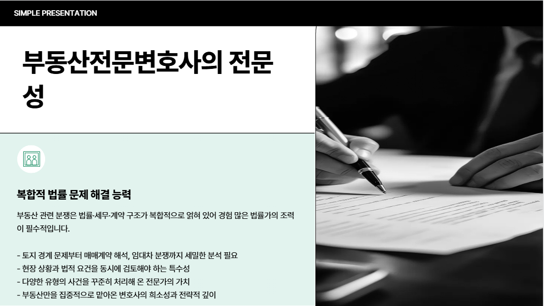 부동산 관련 분쟁은 법률·세무·계약 구조가 복합적으로 얽혀 있어 경험 많은 법률가의 조력이 필수적입니다. 토지 경계 문제부터 매매계약 해석, 임대차 분쟁까지 각 사안은 세밀한 분석이 필요하고, 현장 상황과 법적 요건을 동시에 검토해야 합니다. 이러한 특성 때문에 다양한 유형의 사건을 꾸준히 처리해 온 전문가의 가치는 더욱 높게 평가됩니다. 실제로 부동산만을 집중적으로 맡아온 변호사는 수가 많지 않아 희소성이 높고, 대응 전략에서도 깊이가 확연히 드러납니다.