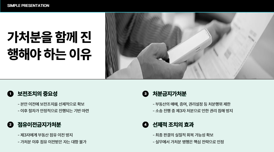 본안 이전에 보전조치를 선제적으로 확보해두면 이후 절차가 훨씬 안정적으로 진행됩니다. 점유이전금지가처분, 처분금지가처분 등은 상대방이 재산을 옮기거나 지위를 변경해 결과가 무의미해지는 상황을 예방하는 역할을 합니다. 조치를 제때 하지 않으면 최종 판결을 받아도 실질적 회복이 어려워질 수 있어, 실무에서는 가처분을 병행하는 것이 사실상 핵심 전략으로 여겨집니다.