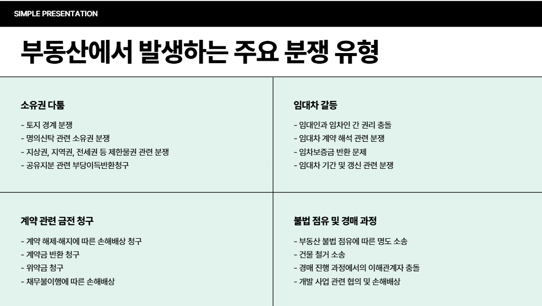 현장에서 가장 자주 마주하는 문제는 소유권 다툼, 임대차 갈등, 계약 해제·해지와 관련된 금전 청구, 불법 점유, 경매 과정에서의 이해충돌 등으로 이어집니다. 여기에 개발 사업과 관련된 협의, 공사 지연으로 인한 손해배상 청구까지 더해지면 사건의 범위는 훨씬 넓어집니다. 각 분쟁은 사실관계가 조금만 달라져도 결론이 바뀌기 때문에 구조를 정확히 파악하는 능력이 매우 중요합니다.